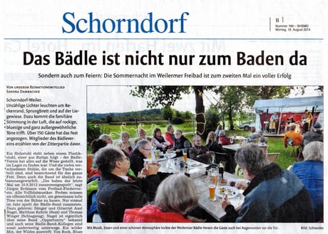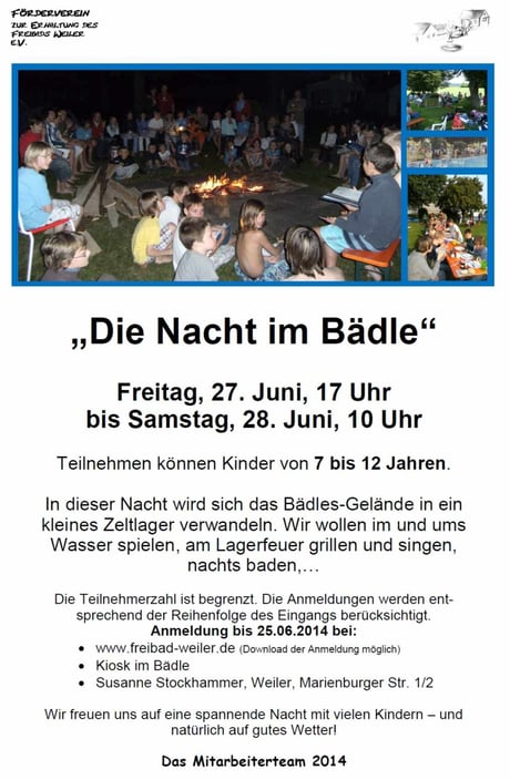 Am 15.08.2014 steigt im ältesten Freibad des Rems-Murr-Kreises die zweite Auflage der  „Sommernacht im Freibad Weiler“. Zugnummer der Veranstaltung ist wie im Vorjahr die Bädlesband mit Axel Nagel. Das Bädle wird sich an diesem Tag als Gesamtkunstwerk präsentieren, zusammengesetzt aus Musik, Ambiente, Fotoausstellung und Gaumenschmaus.